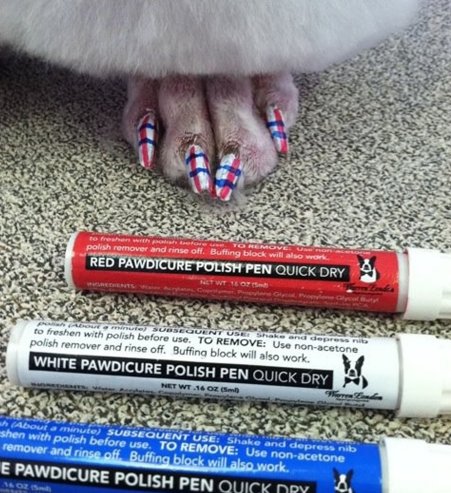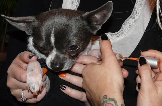 La dernière tendance en matière de mode canine est de peinturlurer les pattes des chiens avec du vernis spécialement conçu pour eux. Le monde des cosmétiques n’est plus pour nous les filles ! Vous saviez même que maintenant il y avait des chaines TV pour les chiens? (ah oui oui!) On pourra peut- être bientôt voir sur nos écrans de télévision des chiens vanter la qualité de tel produit de beauté parce qu’après tout « eux aussi ils le valent bien ».