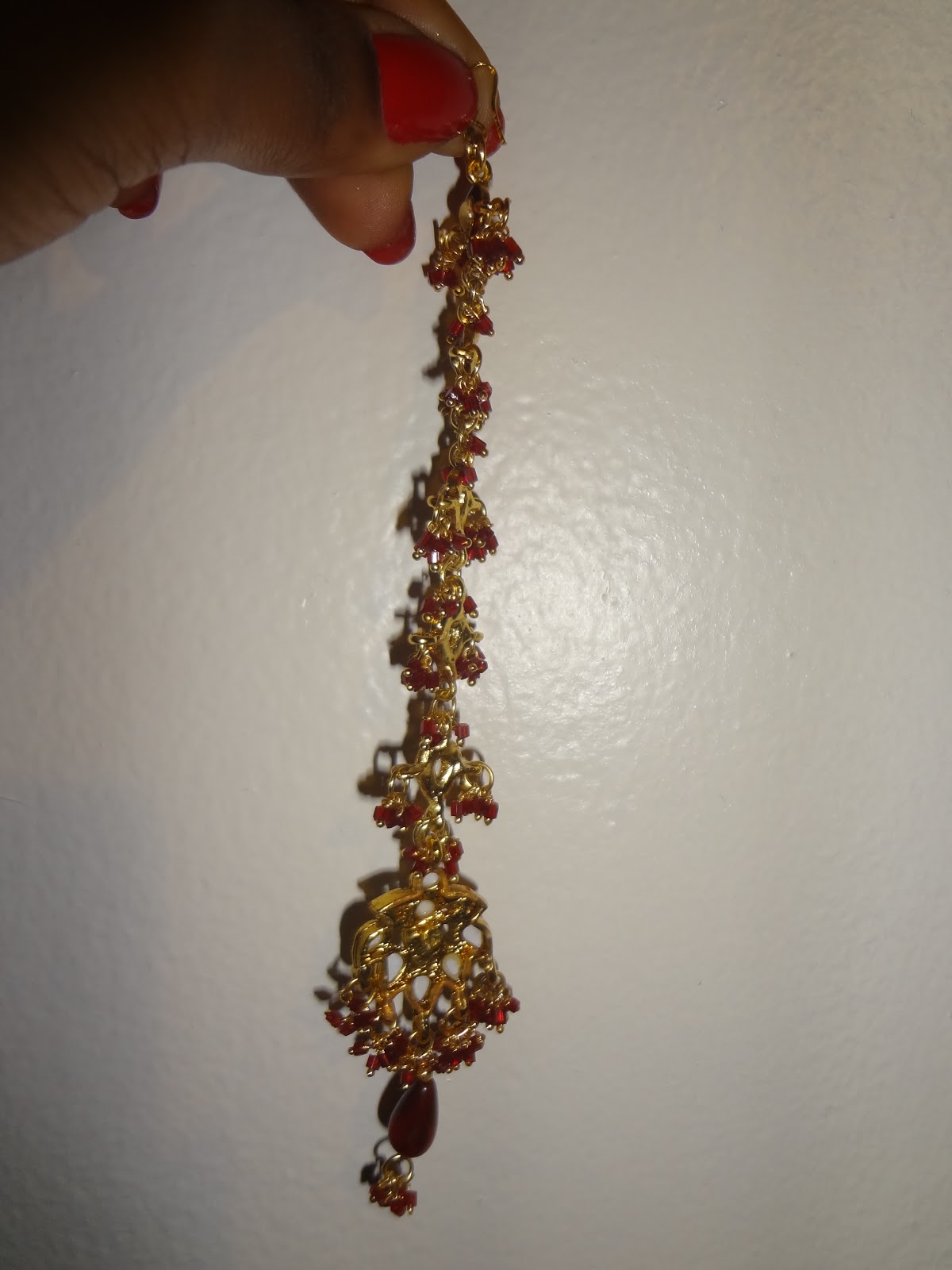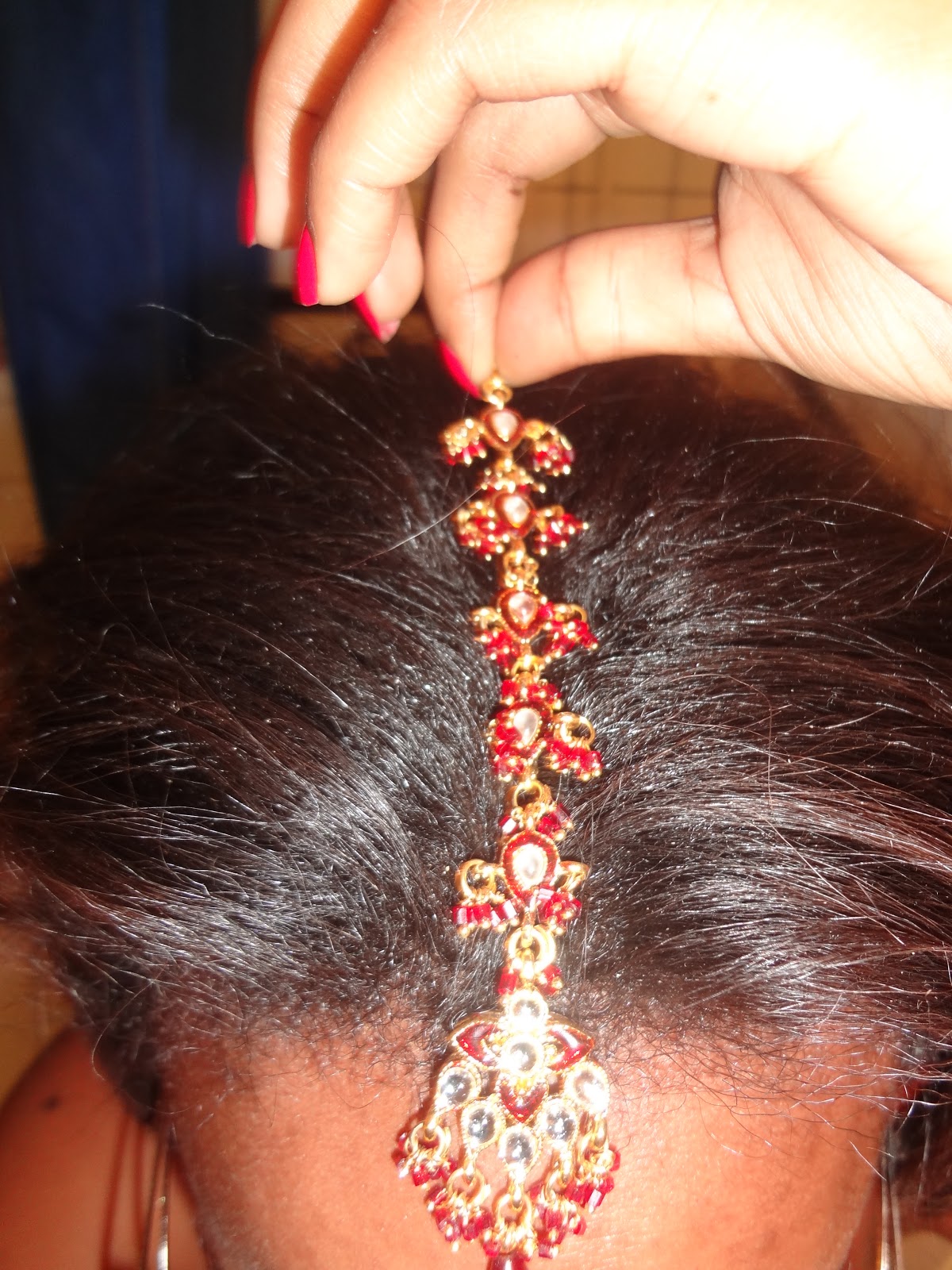 Mon bijou pour cheveux que j'ai appelé le "Bindi" sans même savoir si c'était ça... je sais que le bindi est un point rouge mais bon... je l'ai eu à 8€ au passage Bradi (le passage des indiens) il s'accorche aux cheveux à l'aide d'une petite croche qu'il y a à l'embout. moi j'ai rajouté quelques petites pinces sur les longueurs (j'allais danser alors valait mieux que ça tienne droit!)