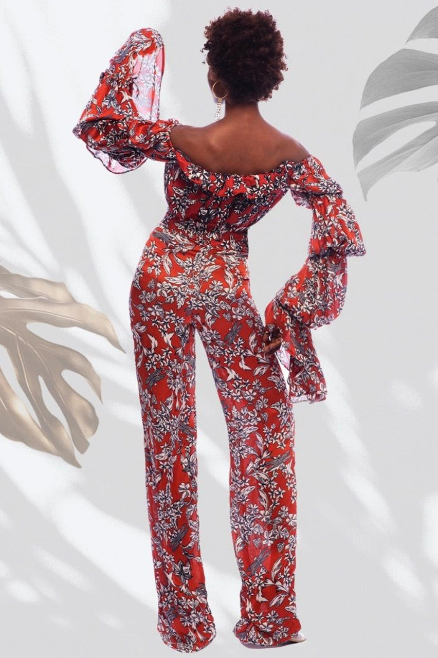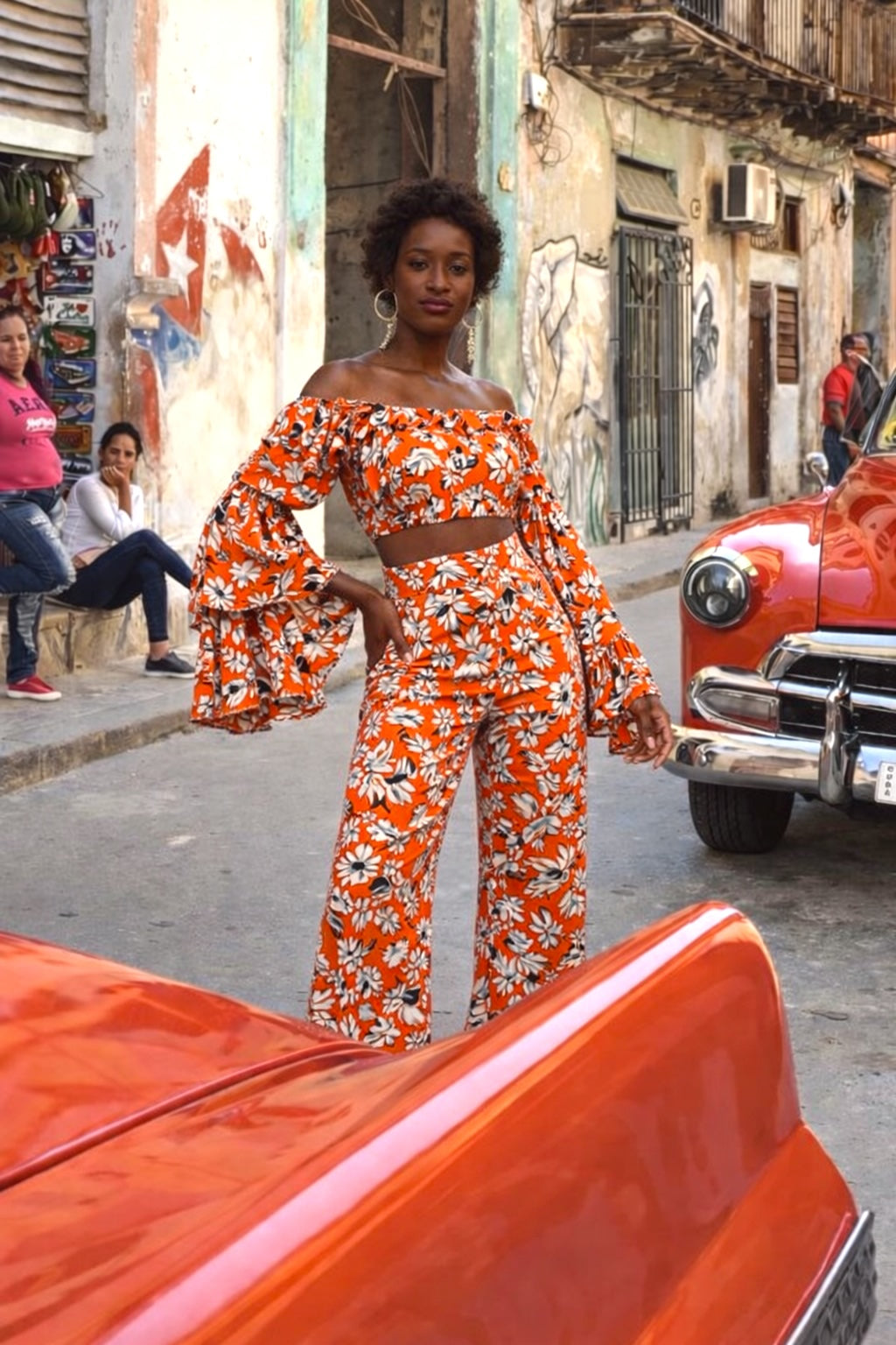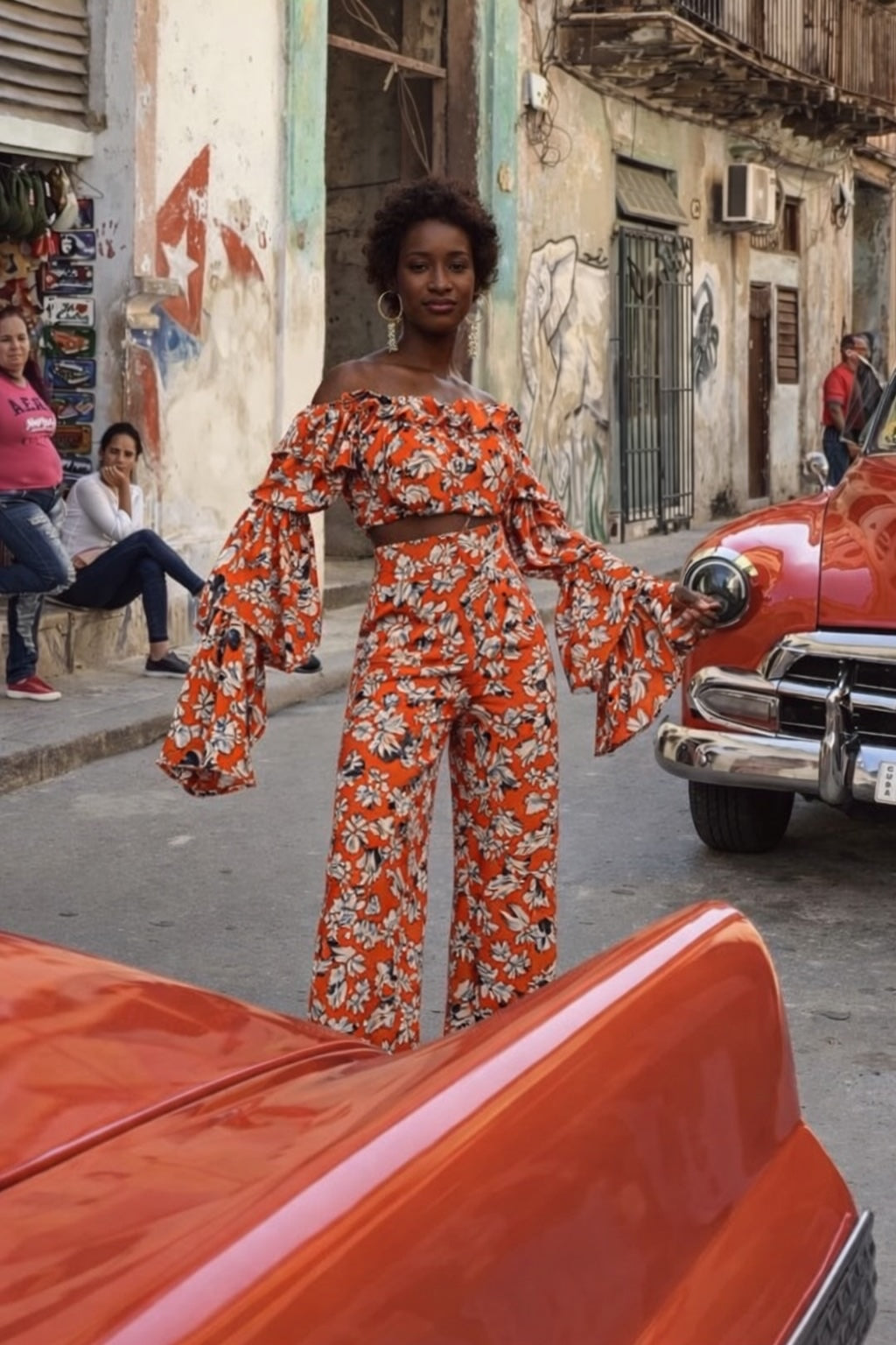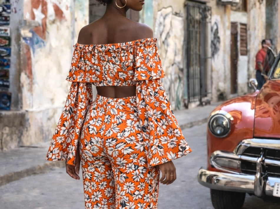Ensemble Off-Shoulder Soie Imprimée — Orange Floral