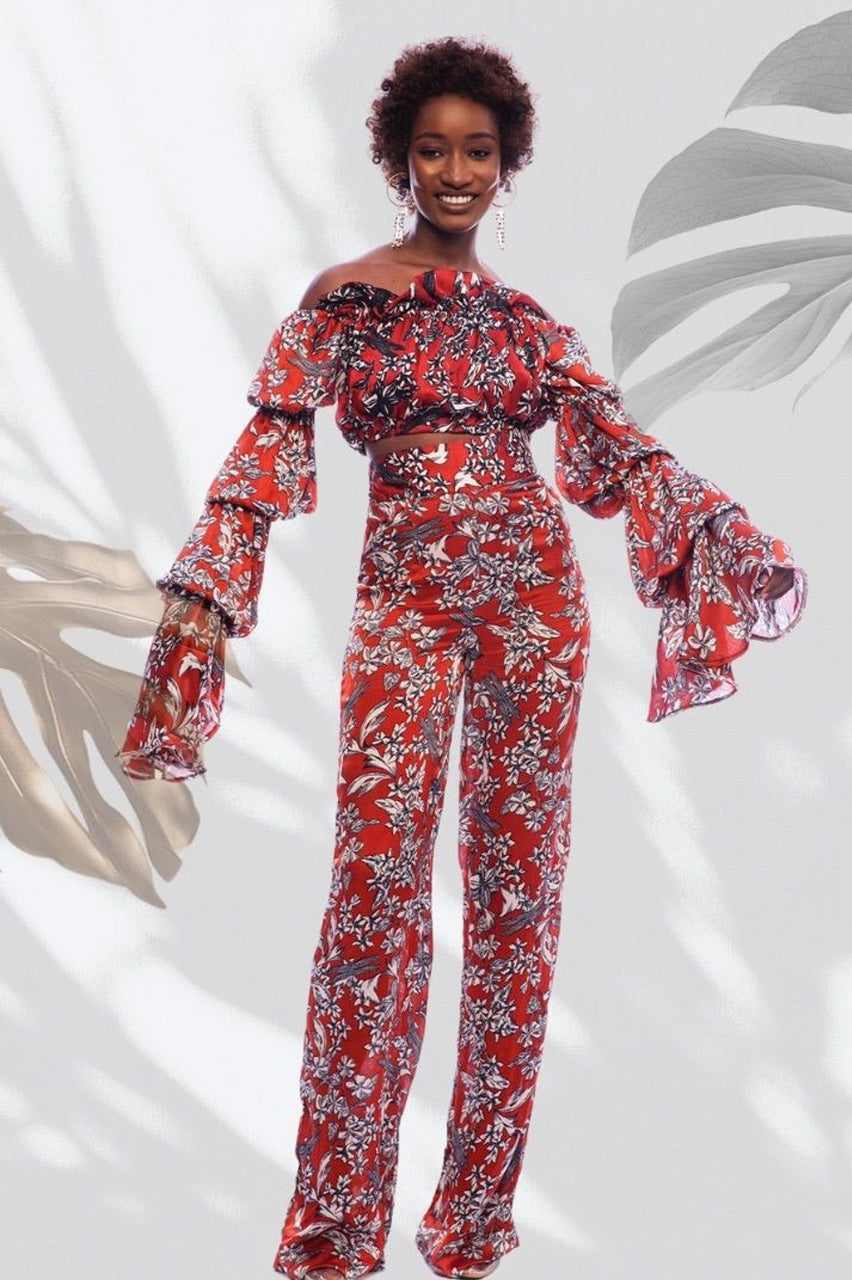 Confectionné en soie pure, cet ensemble off-shoulder capture la lumière et accompagne chaque pas avec fluidité. Les manches à volants, longues et sculpturales, encadrent le geste. Le pantalon flare structure la silhouette tout en conservant une légèreté absolue.