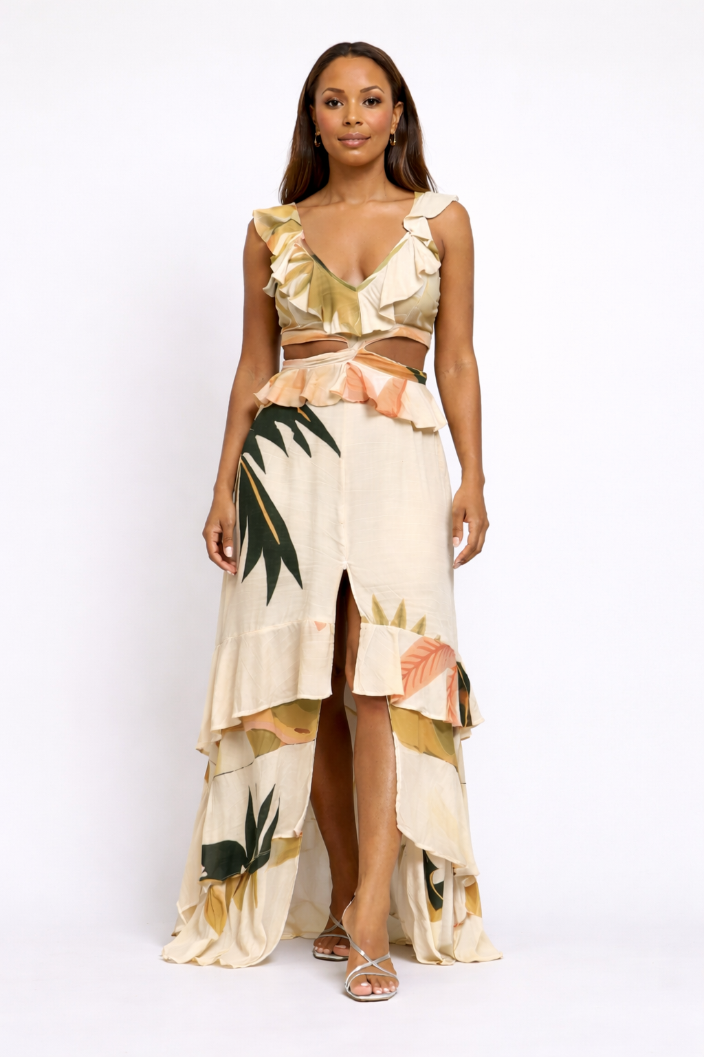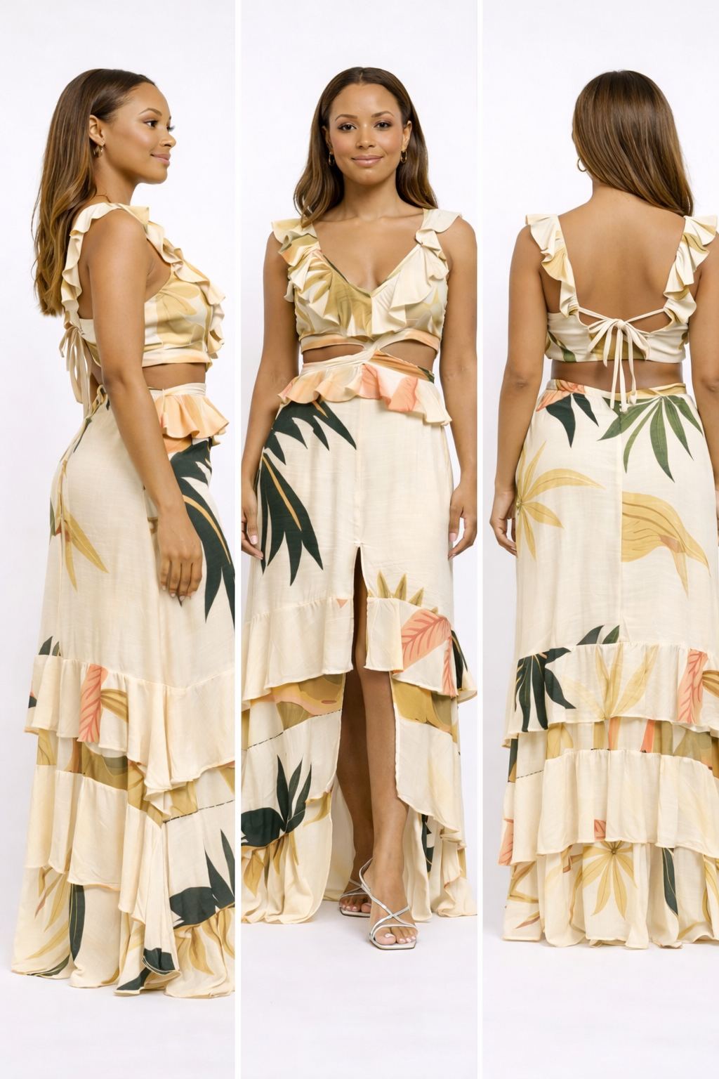 Son imprimé botanique aux accents tropicaux, dans des tons naturels et chaleureux, confère à cette pièce une allure solaire et raffinée, parfaite pour une escapade estivale, un déjeuner en bord de mer ou une occasion élégante en journée.