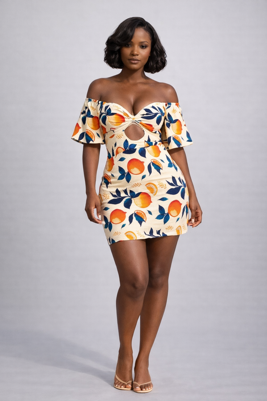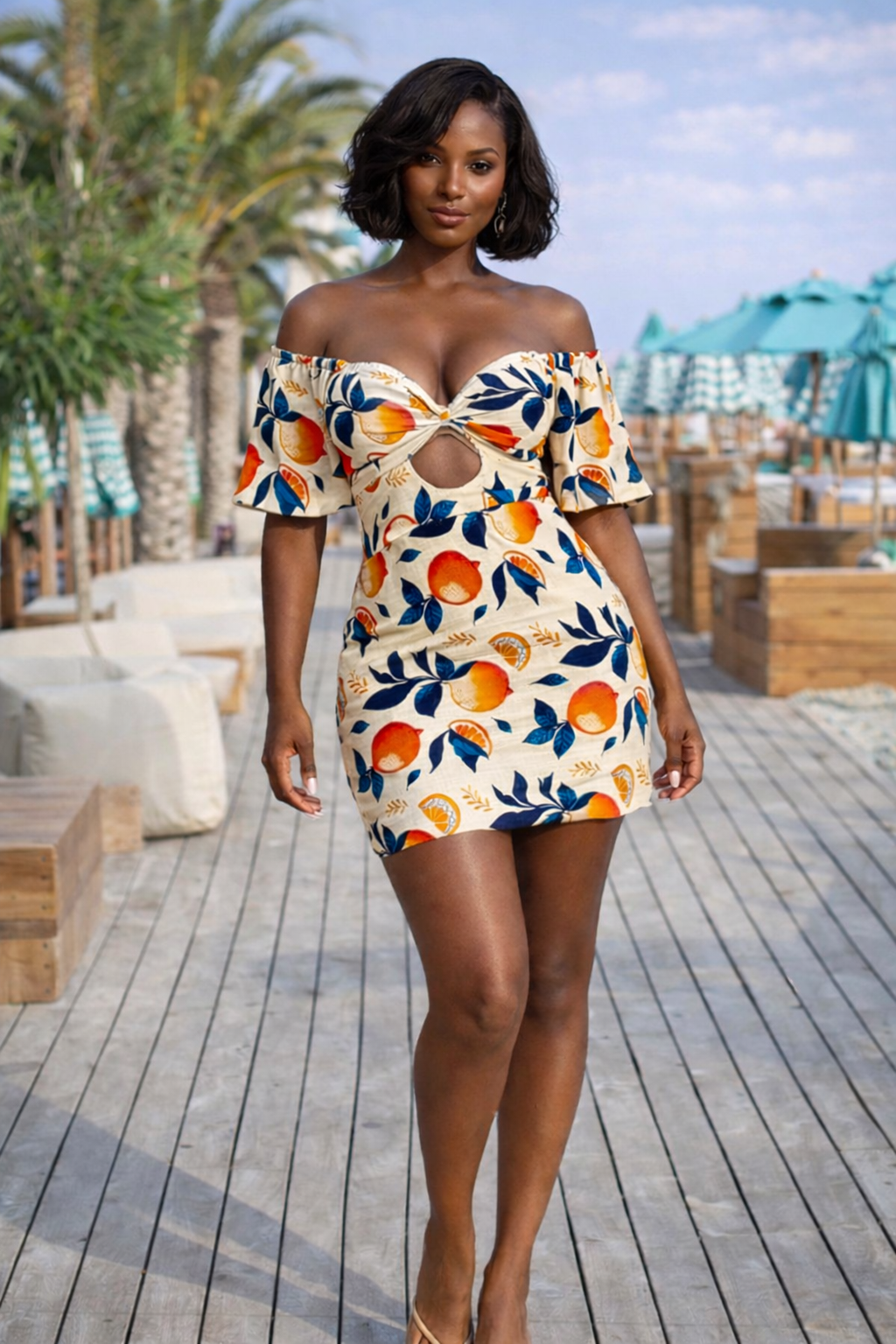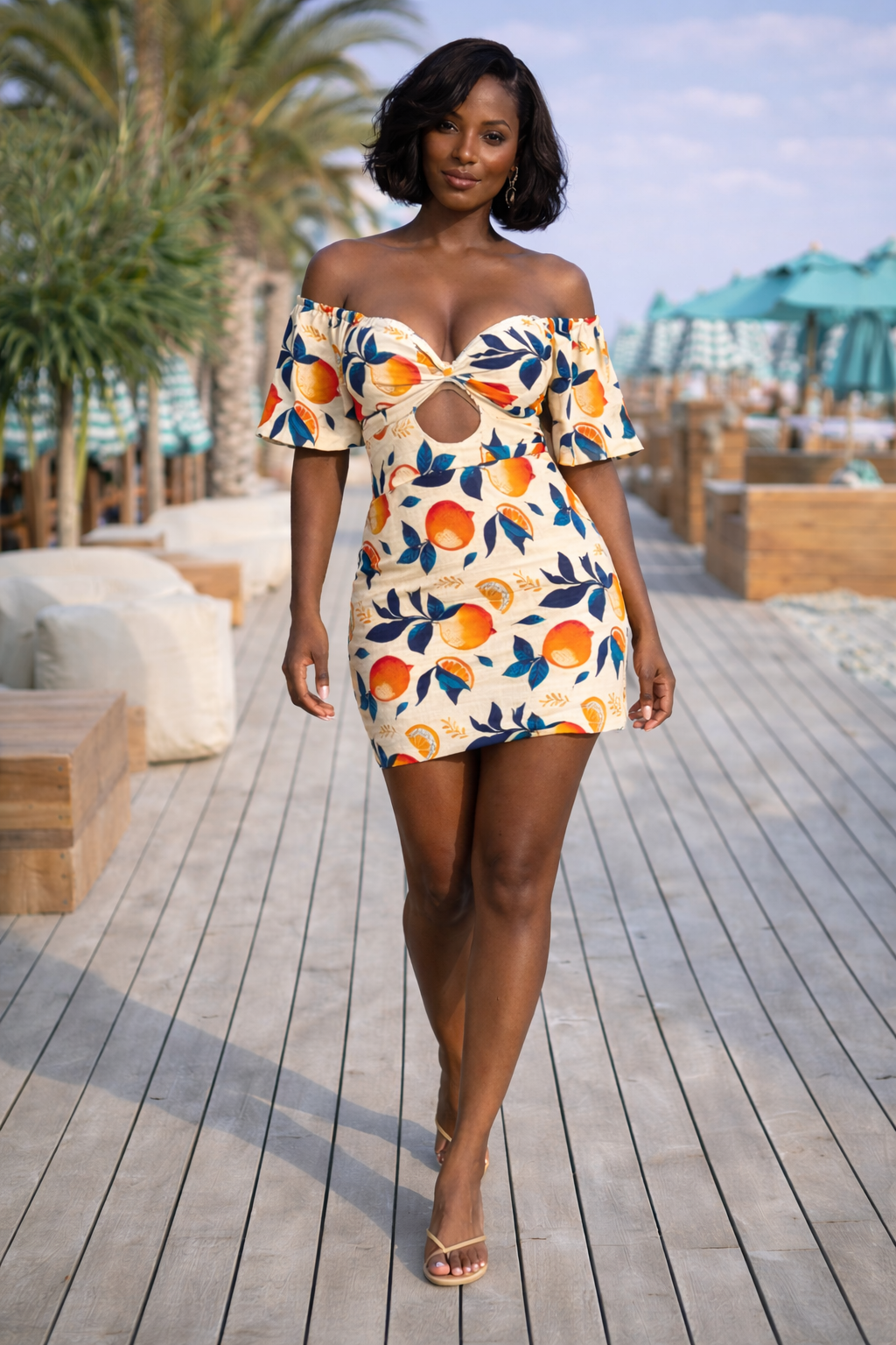 Le détail central ajouré souligne la taille et crée un jeu subtil entre structure et légèreté. L’imprimé fruité, vibrant et solaire, évoque les étés méditerranéens, entre Capri, Cannes et la Dolce Vita.