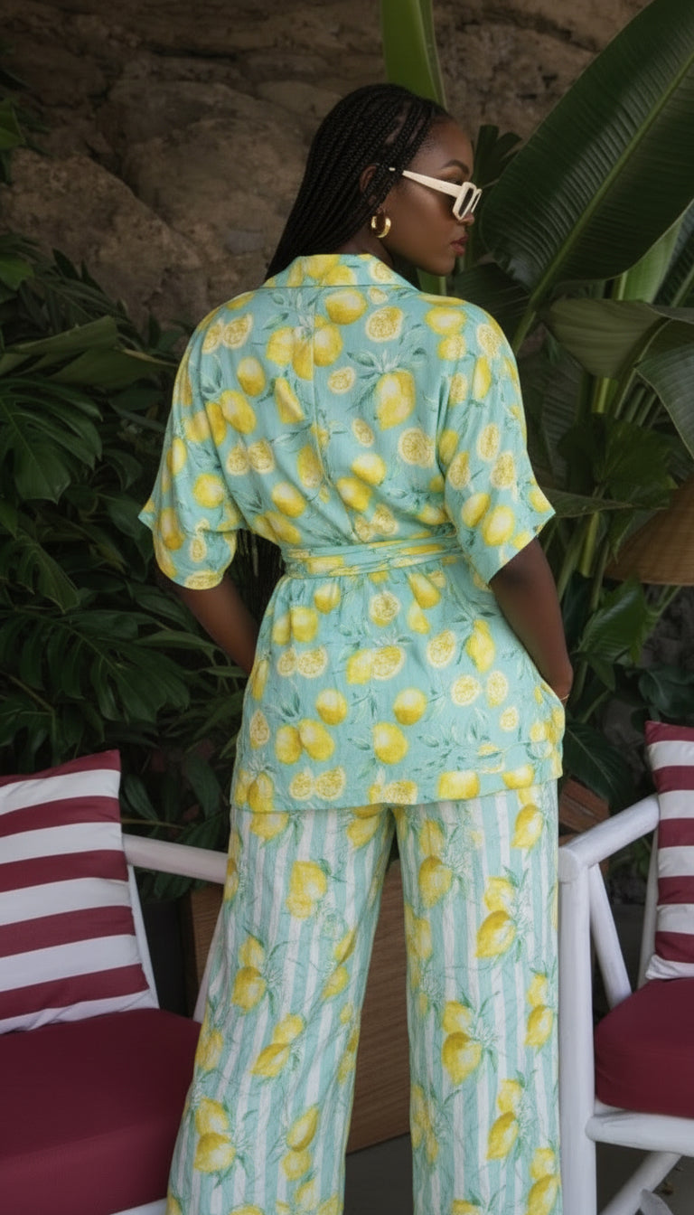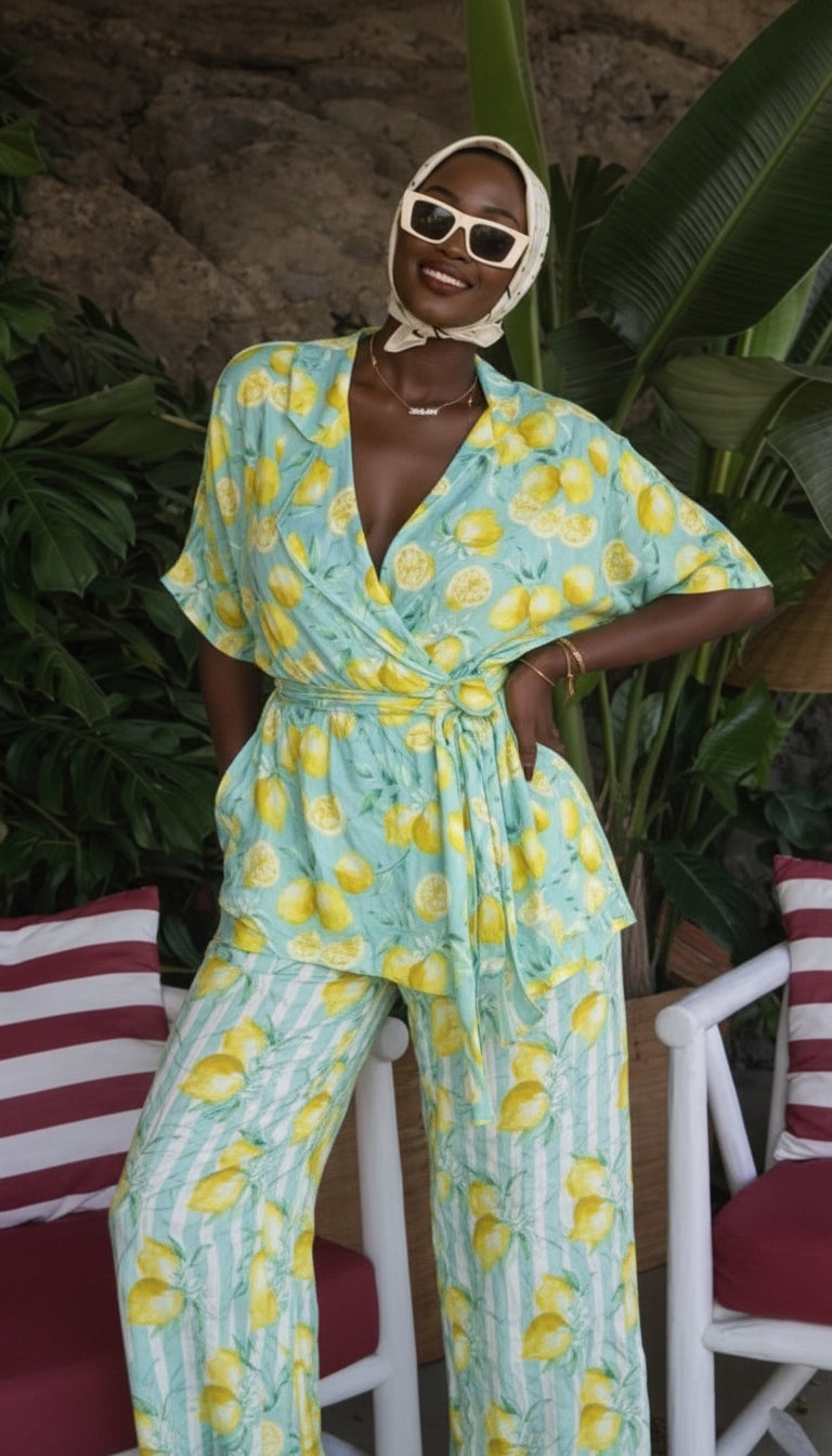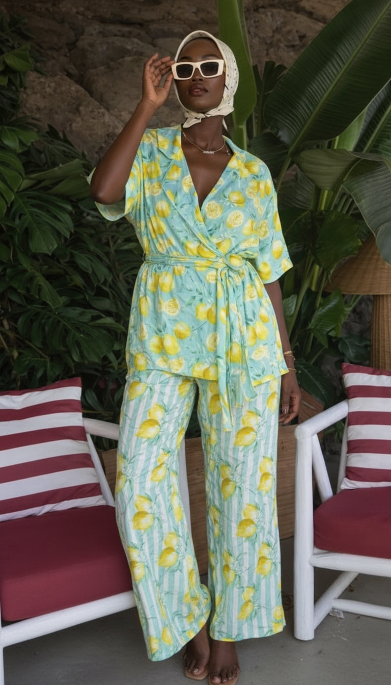 Le haut, délicatement ajusté, met en valeur le buste avec une élégance naturelle. Le pantalon à la ligne longue et fluide allonge la silhouette et crée une allure élancée, parfaite du matin jusqu’aux soirées d’été.