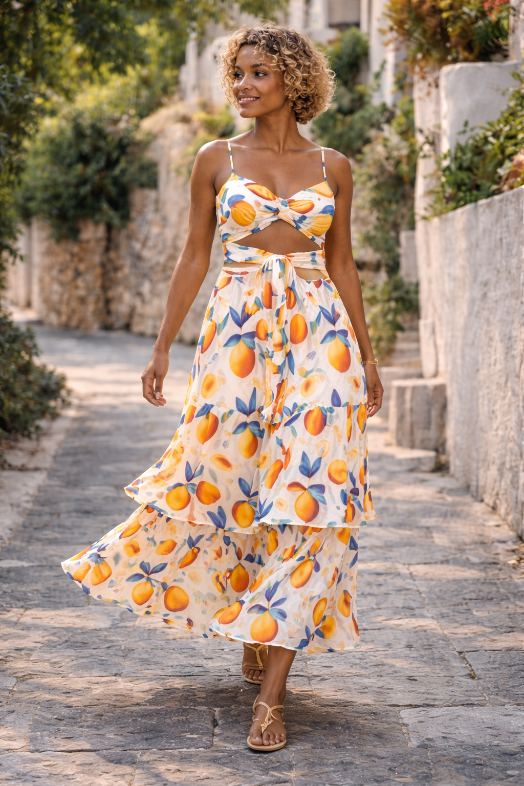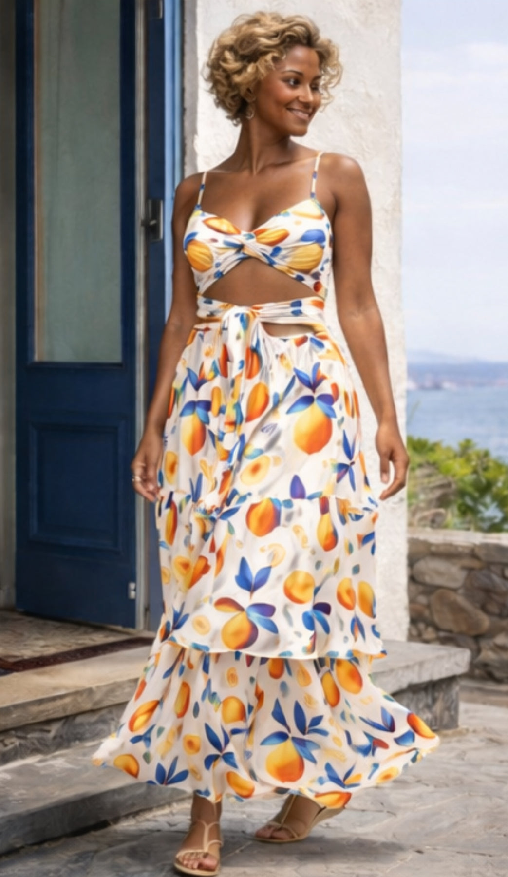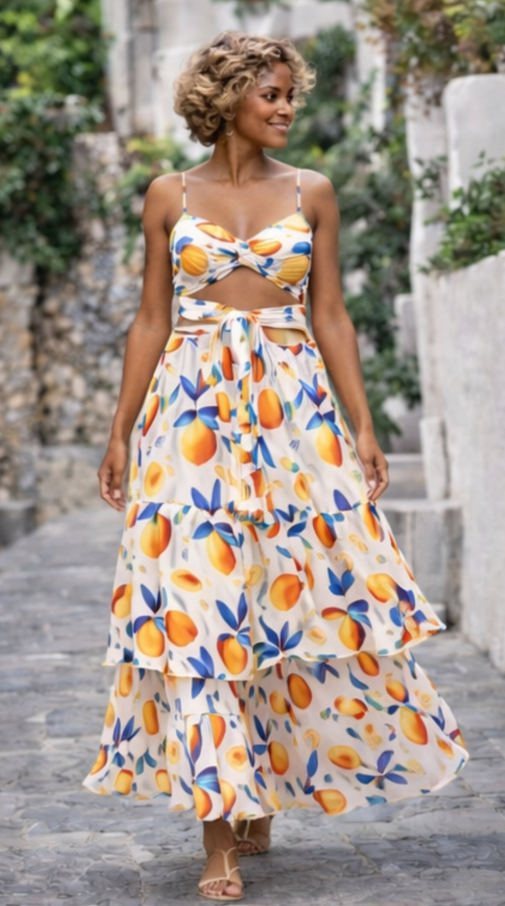 Son imprimé fruité évoque l’évasion, le soleil et l’été, faisant de cette pièce une robe idéale aussi bien pour une journée en ville que pour une escapade en bord de mer ou une occasion estivale élégante.