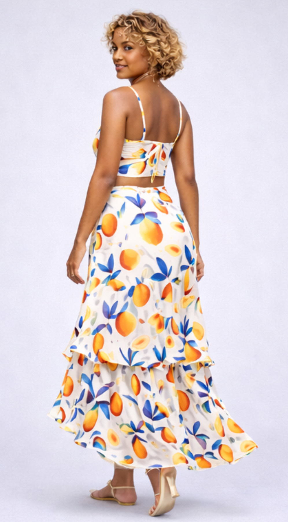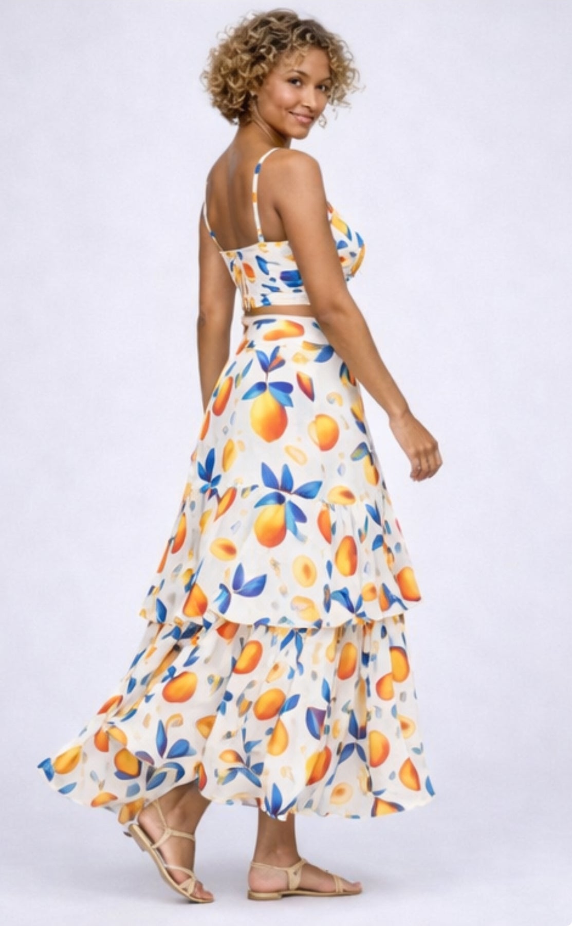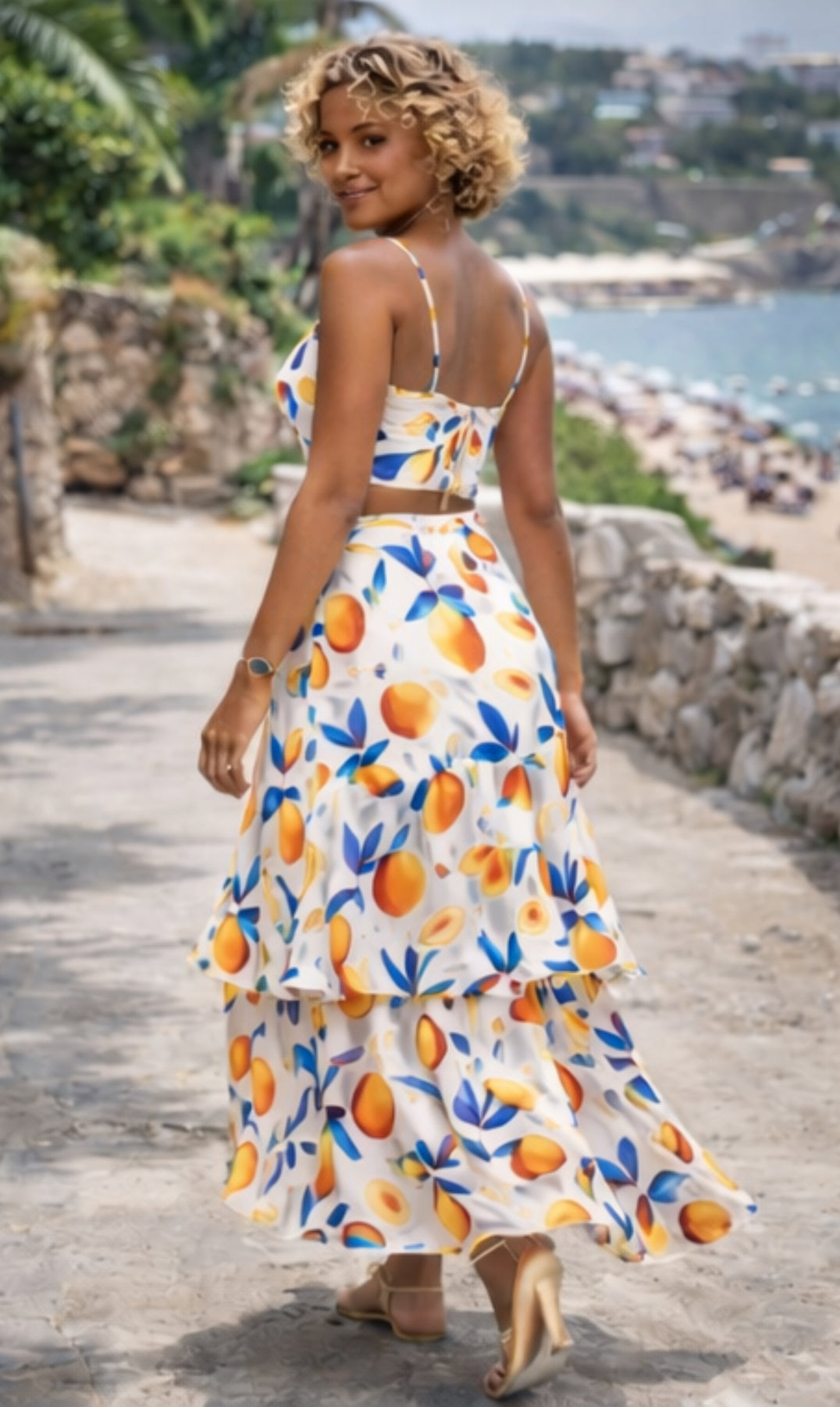 Le haut structuré, souligné par de fines bretelles et un jeu de découpes délicat, met subtilement en valeur le décolleté et la taille. La jupe longue, composée de volants étagés, apporte du rythme et une sensation de légèreté à chaque pas, donnant à la robe une allure résolument féminine et moderne.